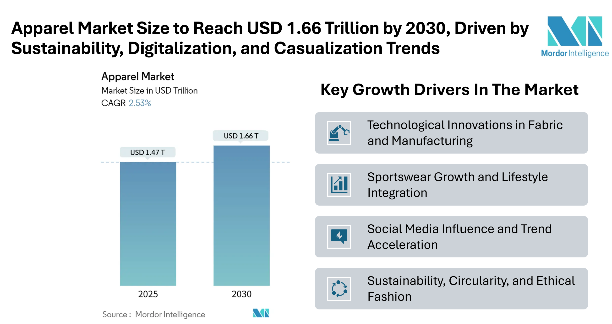 According to Mordor Intelligence, the global apparel market size is poised to expand from USD 1.47 trillion in 2025 to USD 1.66 trillion by 2030, registering a CAGR of 2.53%. Despite economic uncertainty and inflation in advanced markets, factors such as rising discretionary spending, digital transformation, and demand for sustainable, comfort-first apparel continue to shape the industry.