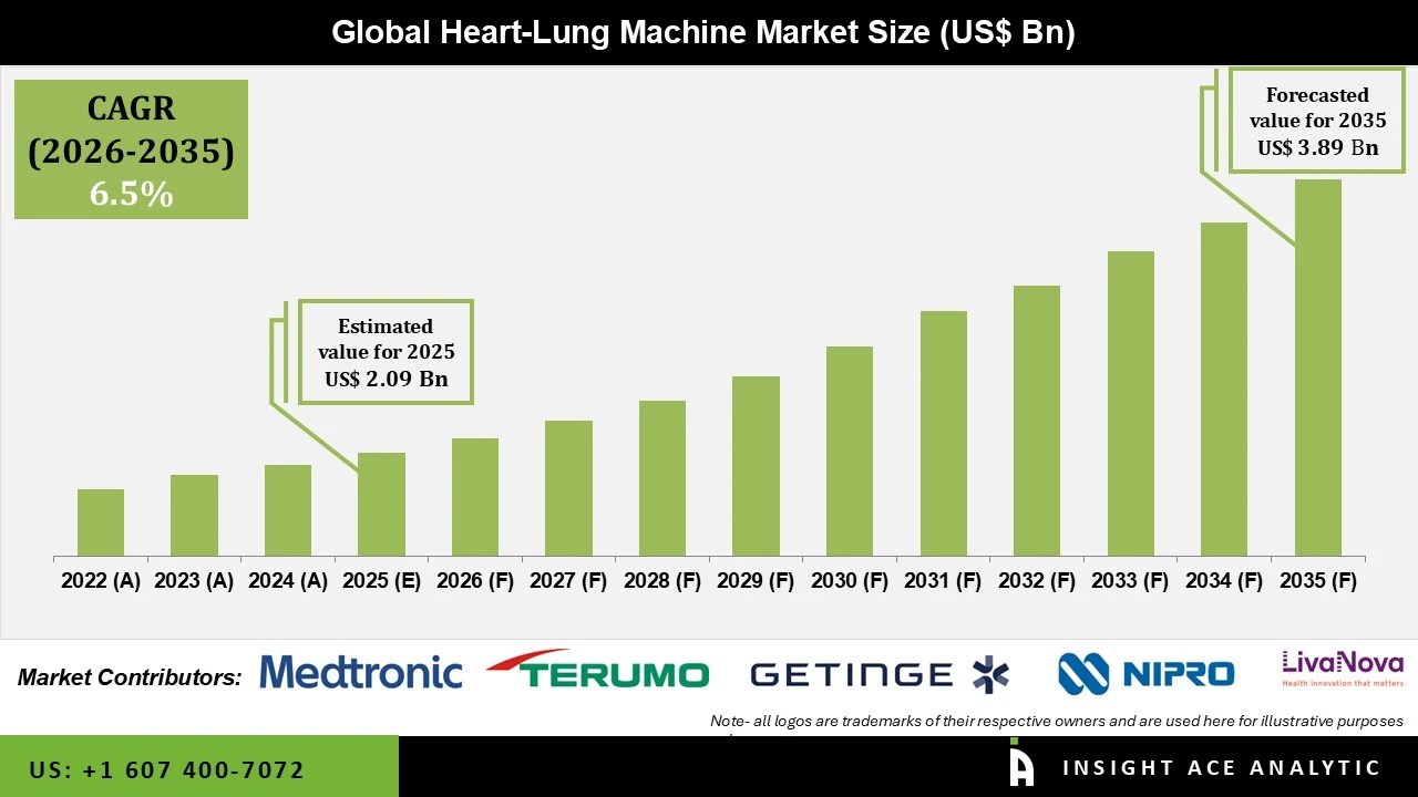 InsightAce Analytic Pvt. Ltd. announces the release of a market assessment report on the “Global Heart-lung Machine Market Size, Share & Trends Analysis Report By Product Type (Capital Equipment [Heater-Cooler Units / Heat Exchange Systems, Monitoring Systems, Pumps, Others] and Consumables [Oxygenators {By Product (Membrane Oxygenators, Pediatric/Neonatal Oxygenators, ECMO Oxygenators, Other Oxygenators), By Age Group (Adult, Pediatric)}, Cannulas {By Product (Venous Cannulas, Arterial Cannulas, ECMO Cannulas, Cardioplegia Cannulas, Vent Cannulas), By Age Group (Adult, Pediatric)}, Blood Reservoirs & Filtration Systems, Accessories & Consumables, Tubing Sets & Circuits]), Application (Heart Valve Surgeries, Coronary Artery Bypass Grafting (CABG), Lung Transplant, Heart Transplant, and Others), End-user (Private Healthcare Institutions and Public Healthcare Institutions),-Market Outlook And Industry Analysis 2035″