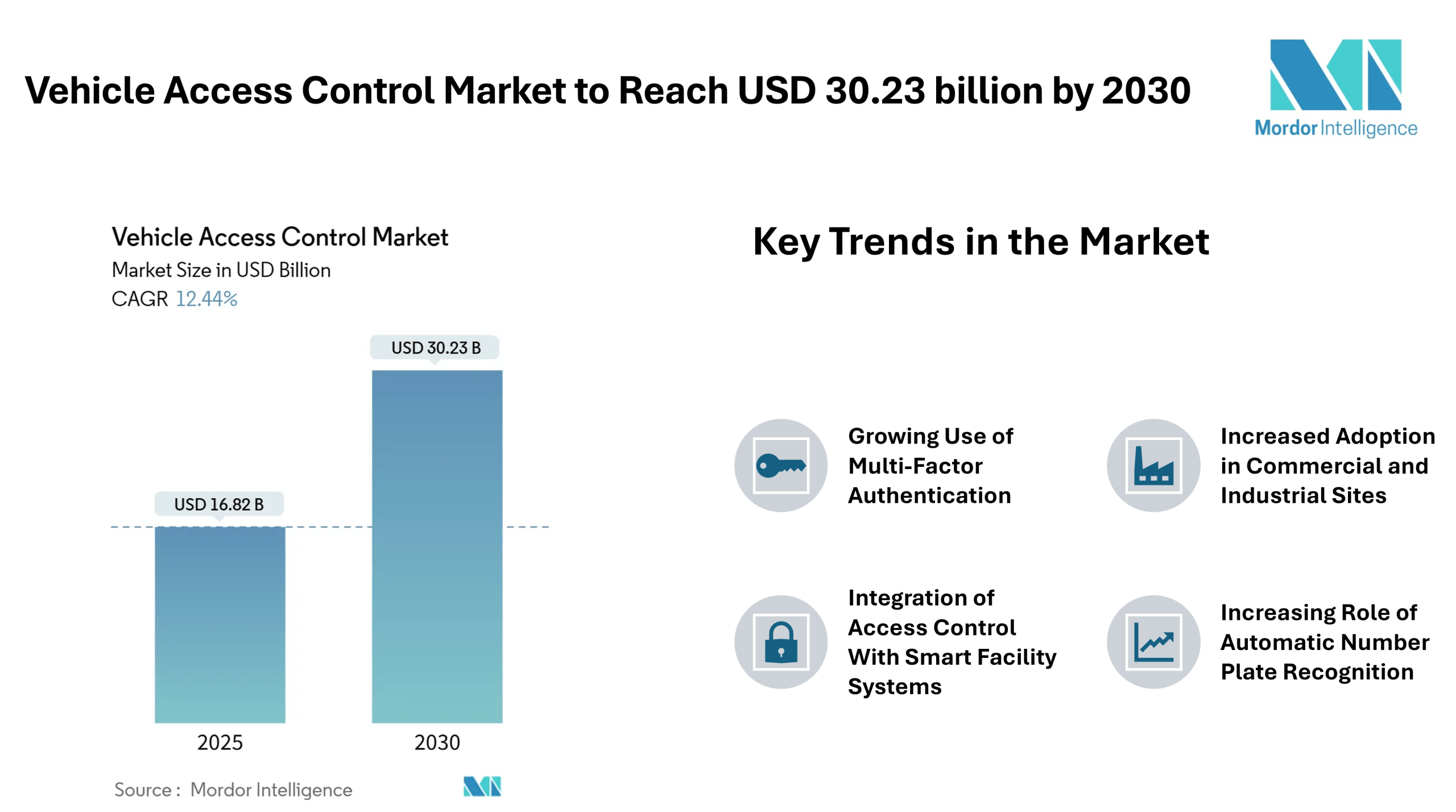 The vehicle access control market reached USD 16.82 billion in 2025 and is set to expand to USD 30.23 billion by 2030, registering a 12.44% CAGR as software-defined vehicles draw security deeper into core automotive architectures. This outlook reflects continued interest in automated entry systems, expanding deployment of multi-layer authentication, and increasing prioritization of facility security across industrial, commercial, and government environments. As organizations invest in structured campus management, controlled parking automation, and gate-based authentication systems, demand for vehicle access control solutions continues to build across regions.